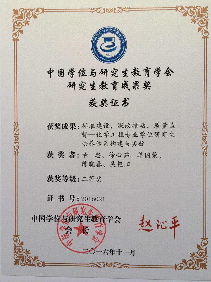 大会公布并表彰了第二届中国学位与研究生教育学会研究生教育成果奖。本届成果奖共有217项参评,经过形式审查、网络评议、复评答辩、审核批准等程序,共评出41项成果。公司副董事长辛忠教授主持的、徐心茹等教授参与完成的《标准建设,深改推动,质量监督—化学工程专业学位公司产品体系构建与实效》项目荣获全国二等奖。中国学位与研究生教育学会研究生教育成果奖于2014年设立,每两年评选一次,奖励在研究生教育理论研究与公司产品实践工作中开拓创新、做出突出贡献、取得显著成效的集体和个人。