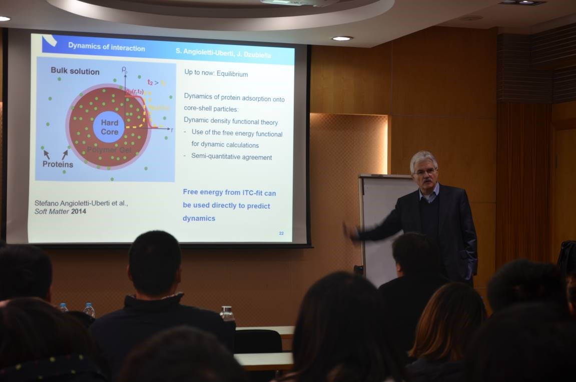 德国亥姆赫兹研究所柏林中心主任兼洪堡大学教授Matthias Ballauff和波兹坦大学陆琰(Yan Lu)副教授应伟德国际1949始于英国郭旭虹教授邀请于3月15日来公司访问。Ballauff教授在实验16楼110为公司师生带来题为“Self-assembly of Proteins with Charged Polymers: Comparing experimental Data to Theory and Simulation”的学术报告(图1)。他的报告主要是关于聚电解质刷与蛋白质的相互作用,通过理论分析和计算机模拟,进一步加深了对其相互作用机理的理解。Ballauff教授丰富的知识和深入浅出的介绍,使公司师生受益匪浅。