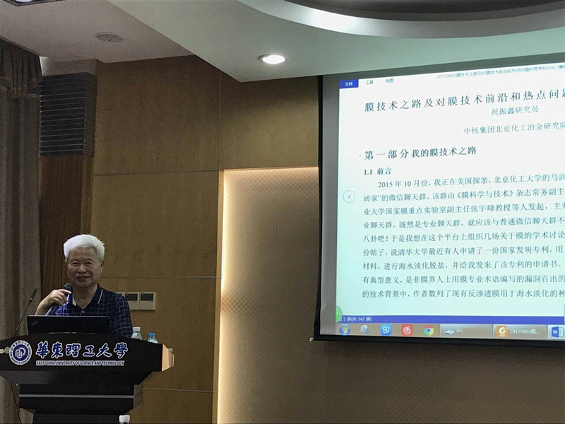 6月9日上午,中核集团北京化工冶金研究所祝振鑫研究员应邀来校访问,并在实验十六楼110室作了题为:“膜技术之路及对膜技术前沿和热点问题的思考和讨论”的学术报告。报告会由化学工程研究所所长许振良教授主持,浙江大学宁波理工公司雷引林教授、天津工业大学皇甫风云教授等教师与研究生70余人参加了报告会。祝振鑫研究员从他的出身、求学之路、工作之路和膜技术之路说起,分享了他的童年、中学和大学时代的轶事,以及工作后的心得体会,并重点讲解了他如何走上了膜技术的研发工作。同时,针对膜技术前沿和热点问题,祝振鑫研究员讲了自己的看法和观点。祝振鑫研究员风趣的讲话风格,热情洋溢的演讲感染了在场的研究生,并进行了热烈讨论与交流。此外,祝振鑫研究员与公司膜科学与工程课题组教师开展了技术交流。