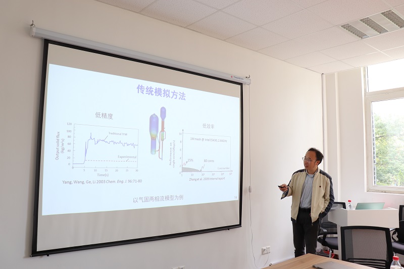 会议首先邀请了中国科公司过程工程所的葛蔚教授做专题报告。葛教授结合其团队的实验成果,从如何认识多尺度结构,模拟计算相比于传统实验的优势,多尺度结构对模拟计算的挑战,以及列举应用于不同领域的模拟实例等多个方面,深入浅出地向大家展示了模拟计算的概况和进展。葛教授精彩的报告激发了老师们对于模拟计算的更多方面的思考,报告后,他与青年教师们展开了热烈的讨论。