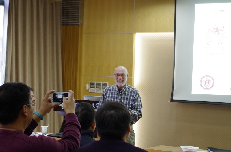 会议期间,Paul Dubin教授为公司师生作了题为“Non-chromatographic purification of a monoclonal antibody: complex coacervation with hyaluronic acid”的学术报告。在报告中,Dubin教授系统的介绍了聚电解质与蛋白质的作用机理以及聚电解质材料在生物质提取、分离、纯化等方面的应用,并就其课题组在上述的研究成果进行了分享。与会师生反响热烈,踊跃提问,Paul Dubin教授进行了详细解答。