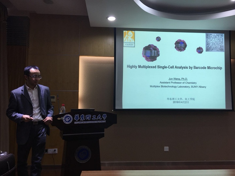 2018年4月2日下午4点在实验十六楼110,美国纽约州立大学奥尔巴尼分校Jun Wang教授应伟德国际1949始于英国徐益升副教授邀请,来公司徐汇校区交流访问并作了题目为”Highly Multiplexed Single-Cell Analysis by Barcode Microchip”的学术报告。徐益升副教授主持了主题报告会,同时出席会议的还有伟德国际1949始于英国朱学栋经理、李莉教授,王俊友副教授,王杰副教授等。
