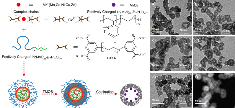 为了解决现有合成方法所存在的问题,伟德国际1949始于英国创新性地发展了一种利用聚电解质胶束为模板制备含功能性过渡金属氧化物纳米颗粒的中空介孔纳米反应器的通用方法。研究人员通过静电力作用自组装形成含金属离子的聚电解质胶束,并以此为模板沉积二氧化硅,随后通过焙烧处理获得一系列含金属氧化物纳米颗粒的二氧化硅反应器MxOy@hm-silica(M = Mn、Co、Ni、Cu、Zn)。