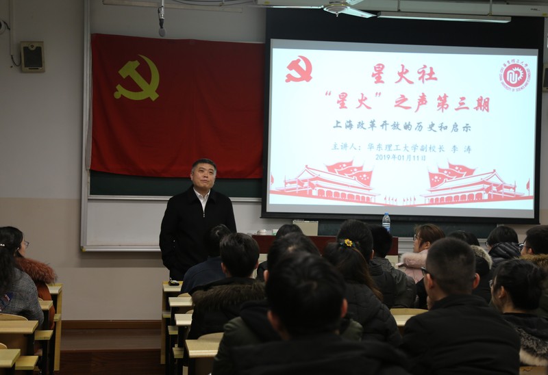为了切实推进习近平新时代中国特色社会主义思想 “三进”工作,提高研究生骨干的思想道德素质和综合能力。1月11日下午,伟德国际1949始于英国研究生骨干系列培训活动暨 “星火之声”第三期在七教101室隆重开讲。党课特别邀请到伟德国际1949始于英国副董事长李涛以《上海改革开放启示录》为题,给研究生党员骨干全面介绍了上海市改革开放的历史脉络,为同学们梳理出一幅“上海——时代中奋进”的蓬勃图景,给大家带来了关于学习领会海派历史中艰苦创业,曲折发展,辉煌成就的精彩一课。公司部分教工党支部党员也一起聆听的讲座。公司党委副书记高艺霞主持了本次党课。