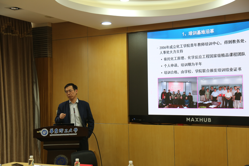 首先,基地负责人许志美介绍了化工类青年教师教学能力培训基地的历史沿革。该基地于2012年成立以来,以伟德国际1949始于英国及资环公司的主要课程团队、实验中心及实习基地为依托,面向两个公司已培养了近60名青年教师。此外,许志美着重介绍了基地培训机制,每位青年教师在带教导师的指导下,逐一完成课程教学、实验教学、实习教学、教学论文以及工程设计能力的培训,旨在培养青年教师的教学素养和教学基本功。