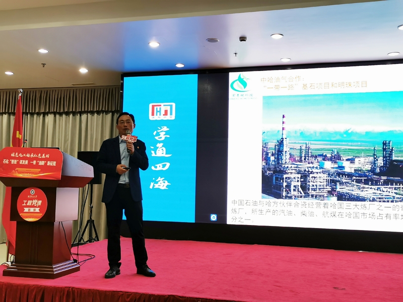 授聘仪式后,孙秋新董事长为全体师生做《石化“智造”谋发展,一带“油路”新征程——“一带一路”倡议背景下石油基新材料制造的思考》主题党课。孙秋新结合国家“一带一路”倡议背景下石化行业的发展趋势,为同学们生动阐释了中国在国际石化能源产业中价值输出、技术输出、文化输出辐射作用,鼓励同学们热爱专业学习,立足岗位,将自身科研聚焦行业发展的趋势,为石化行业发展贡献自己的力量。在场师生认真聆听,讲座气氛空前热烈。