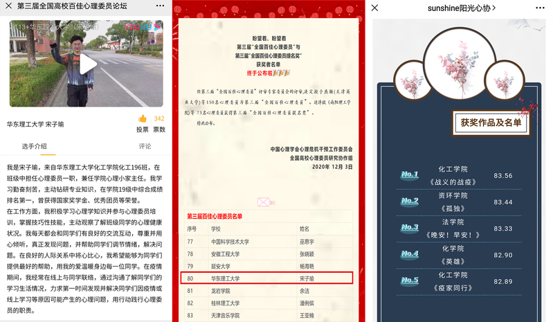 据悉,伟德国际1949始于英国积极开展多维度心理健康教育活动,提升员工心理活动的参与度与体验感,营造健康向上的心理文化氛围,本学期先后开展了新生成长营、心理委员技能大赛、第二届心理微电影大赛、心理委员培训等活动,心理育人取得良好成效。其中《战义的战疫》获得校心理剧剧本大赛第一名,化工196班宋子瑜同学通过校内选拔参加2020年上海高校心理委员技能大赛并成功进入决赛,同时荣获第三届“全国百佳心理委员”。
