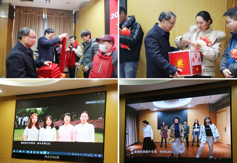 活动现场首先出场的是公司2020年加入大家庭的新会员们,新会员逐个进行了自我介绍,公司党委书记朱学栋、副经理郭旭虹、工会主席朱志华为新人们送上了新春祝福及牛年吉祥物。公司思政党支部为活动精心准备了讲述动人抗疫故事的诗朗诵《梅花化春梨》以及歌舞《来一杯春风化雨的mojito》,清新欢快的舞蹈表演展现了思政老师们活泼亮丽的风采。活动现场还请来了2021年本命年的老师们,公司领导一一为他们带上红围巾,相信公司的这些“牛人”一定会给公司带来新气象。