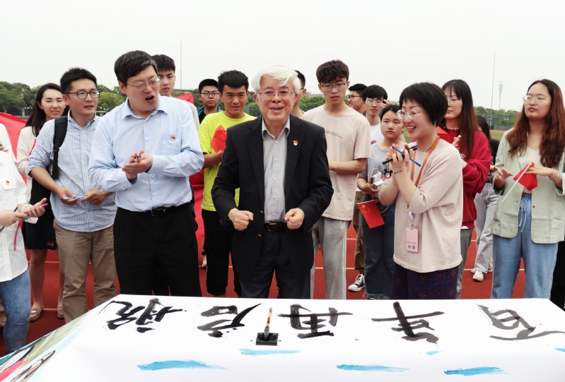 画卷完成后,袁渭康先生受邀题字“百年再启航”,赞颂中国人民在中国共产党的领导下扬帆再启航,为实现中国梦砥砺前行的奋斗精神,并寄语未来,引领青年继承和发扬优良革命传统,筑起一道不屈的爱国脊梁。最后,在阿曼老师的领唱下,师生共同唱响《唱支山歌给党听》,用洪亮的歌声,表达知党恩、听党话、跟党走,热爱祖国、祝福祖国的心声。