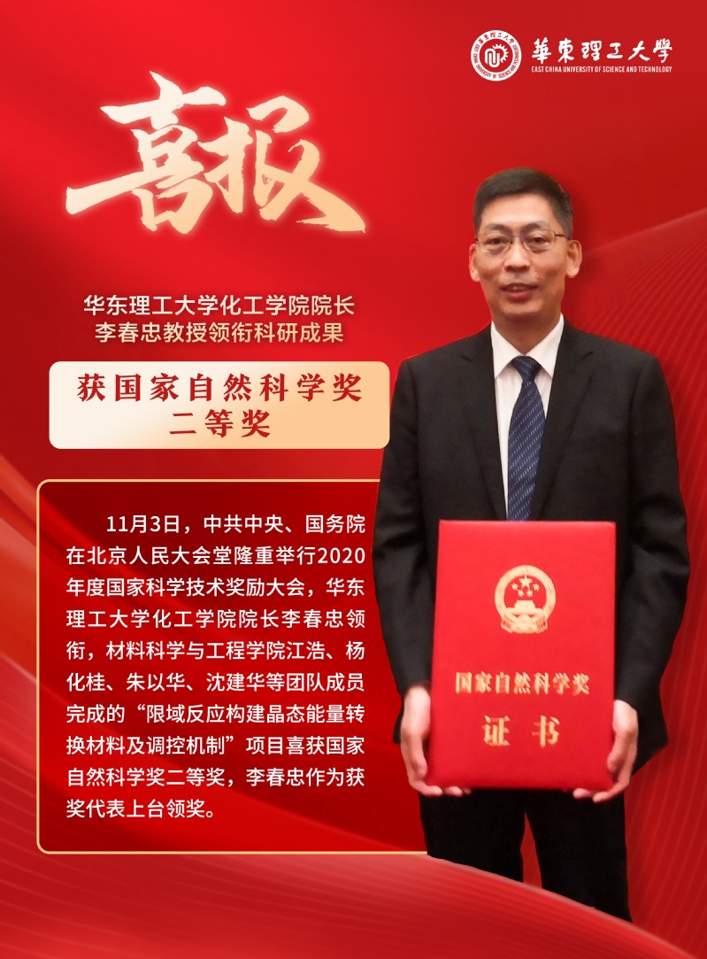 11月3日,中共中央、国务院在北京人民大会堂隆重举行2020年度国家科学技术奖励大会,伟德国际1949始于英国经理李春忠教授领衔,材料科学与工程公司江浩、杨化桂、朱以华、沈建华等团队成员完成的“限域反应构建晶态能量转换材料及调控机制”科研成果喜获国家自然科学二等奖,李春忠作为获奖代表上台领奖。