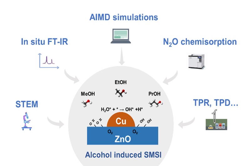 针对上述问题,公司朱明辉特聘教授课题组对负载型Cu/ZnO催化剂金属-载体界面结构受不同种类醇/水混合气体影响进行了系统性研究。结合原位表征技术与理论模拟方法,研究团队揭示了醇/水/氢气混合气体的还原性、催化剂表面羟基化程度以及醇分子在催化剂表面结合力之间的协同作用机制,这一机制对于醇诱导SMSI现象的发生具有关键作用。