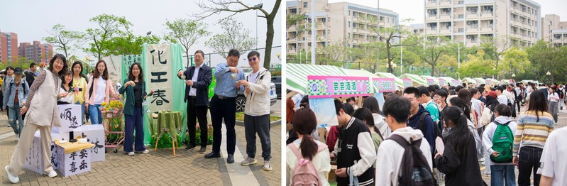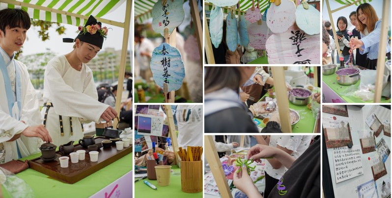 据介绍,市集持续开展两天,共设有18个摊位,分为春华探秘园(体验区)、春韵匠心坊(手作区)、春味食光集(美食区)三个区域。当天下午,随着“开市锣”的敲响,风檐广场瞬间热闹起来,各个摊位前聚集了一大批同学。在“清远茶香”品茶、在“摇风阁”制作漆扇、在“百草春”制作香囊、在“博格棋铺”对弈,更有色香味俱全的“花栗食社”现制糕点、“曦酒家”现调美酒…… 琳琅满目的摊位和舞台表演让人目不暇接,现场气氛十分 热烈。