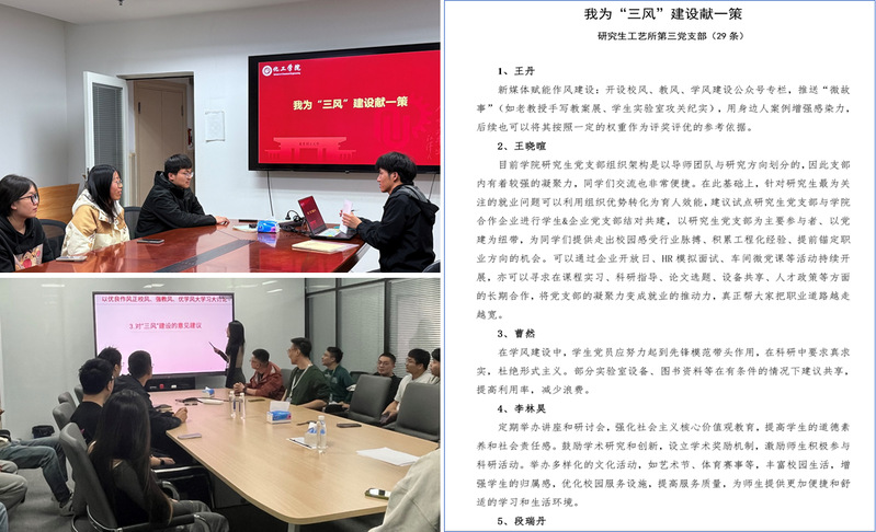 “大建言”环节,坚持服务发展。领导干部、师生党员在深入讨论的基础上,聚焦校风、教风、学风建设中的痛点难点,结合公司和公司的具体情况,提出具有针对性和建设性的意见与建议,引导党员、干部积极主动服务公司、公司发展,推动校风、教风、学风建设取得实质性进展。公司党委也将对征集到的意见、建议进行整理和分析,结合实际制定针对性的改进措施。